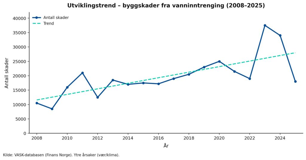 Bakgrunn: Dagens eksisterende bygningsmasse er i stor grad prosjektert etter klimaforutsetninger fastsatt flere tiår tilbake. Ekstremværhendelser som kraftig regn, flom, frost og varmebølger kommer hyppigere og med høyere intensitet. Dette reflekteres i økende skadestatistikk og kostnader.
