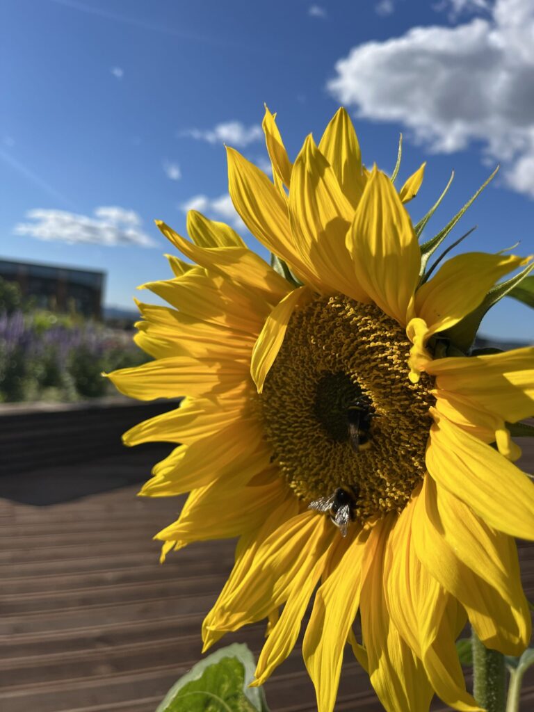 Ruvende over E6 glitrer solen på taket av Construction City. Det er kanskje ikke grønt der oppe enda, men vi ser allerede et par spirer av prydløk som titter frem og strekker seg mot den sterke vårsola. Om kun et par måneder vil takhagen nok engang være i full blomst, til fryd for alle som jobber på Construction City.